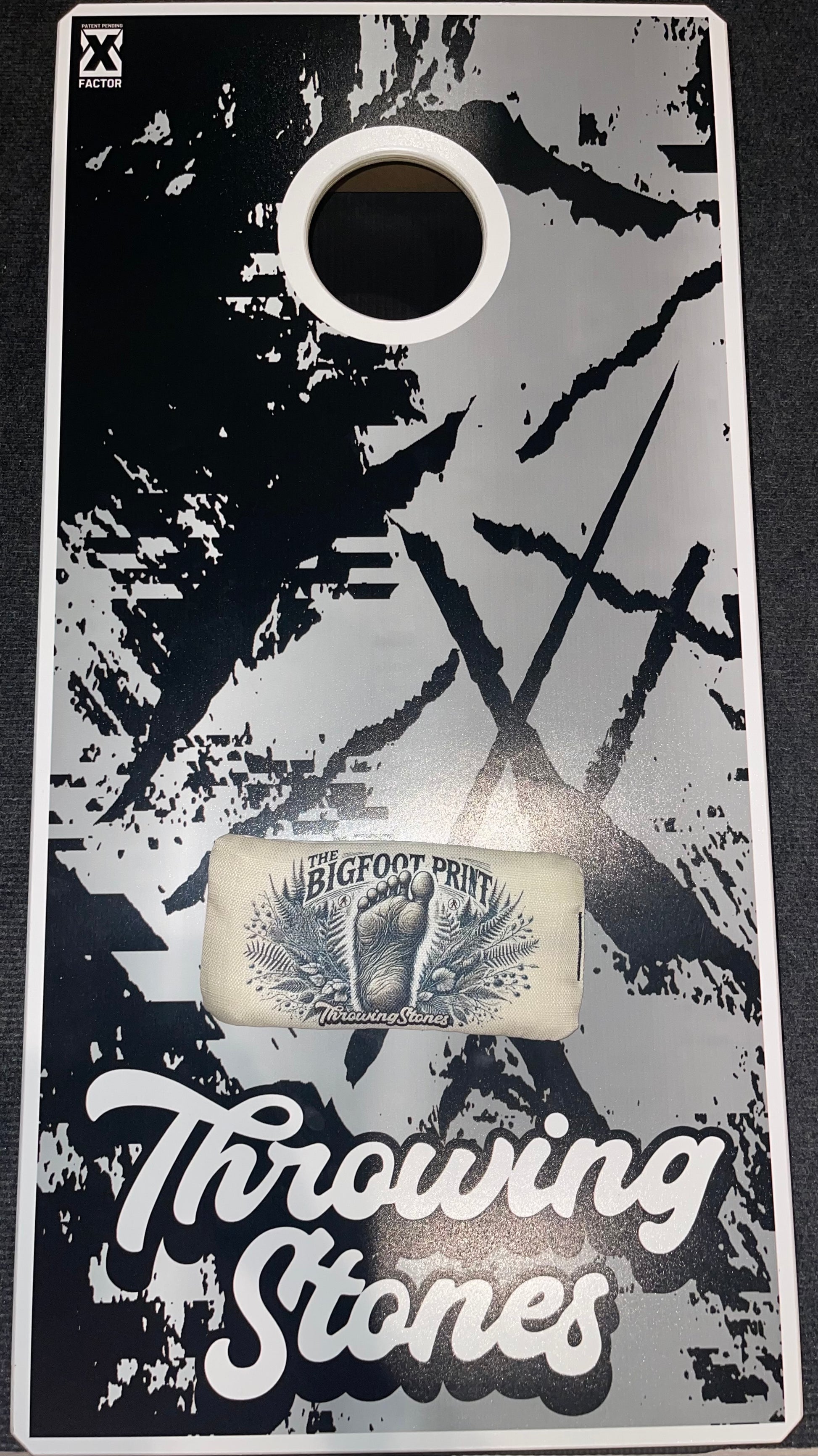 A bold Bigfoot foot graphic acts as a target zone, encouraging players to focus on specific landing areas for their roll bags. The design also offers a unique, eye-catching aesthetic. -